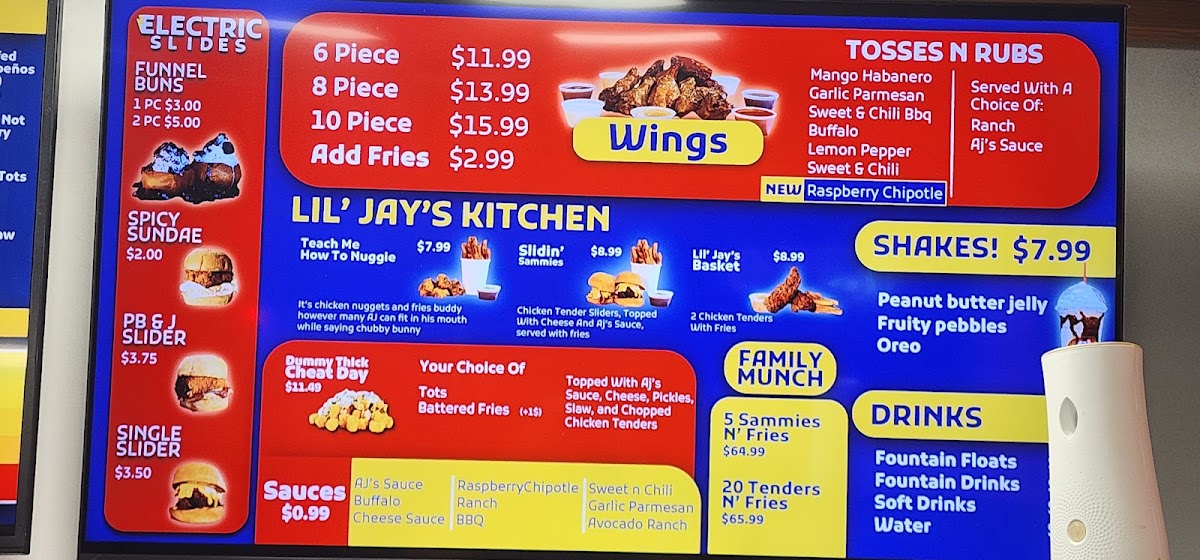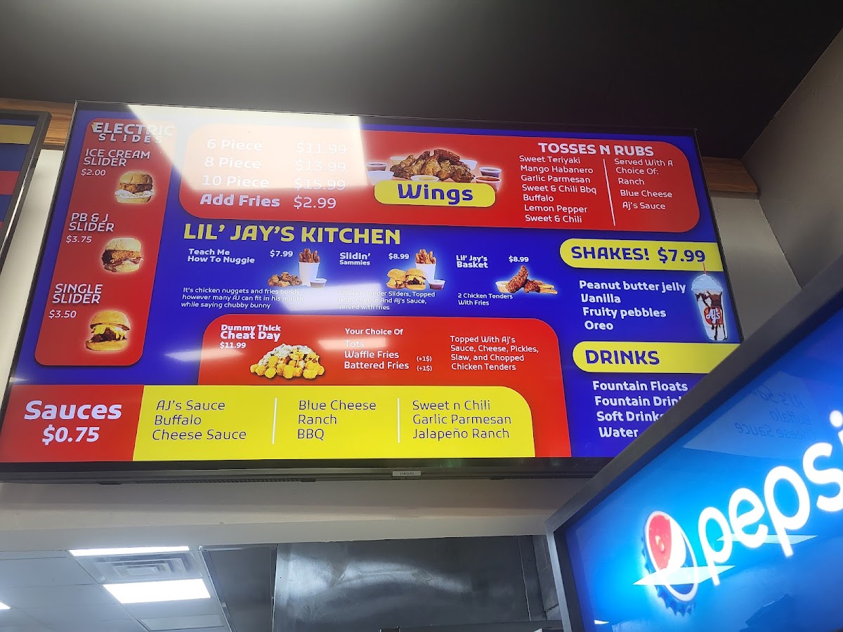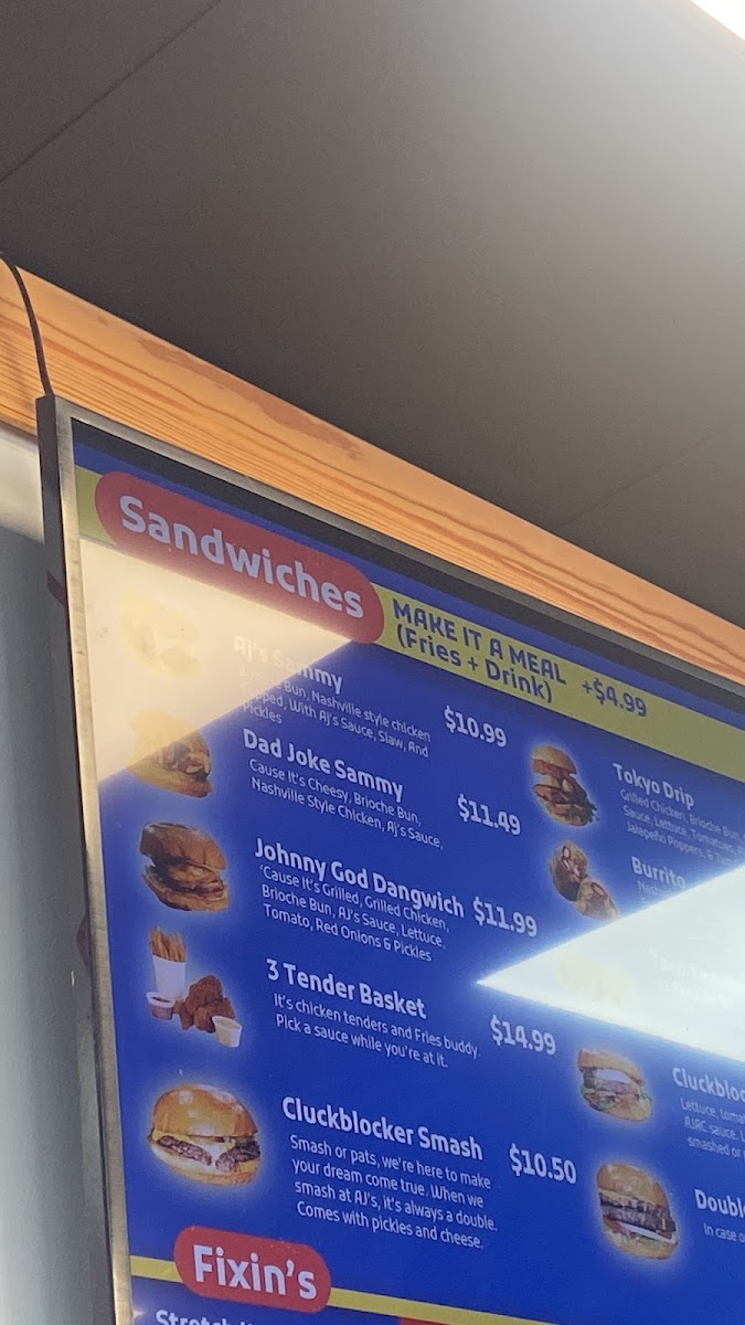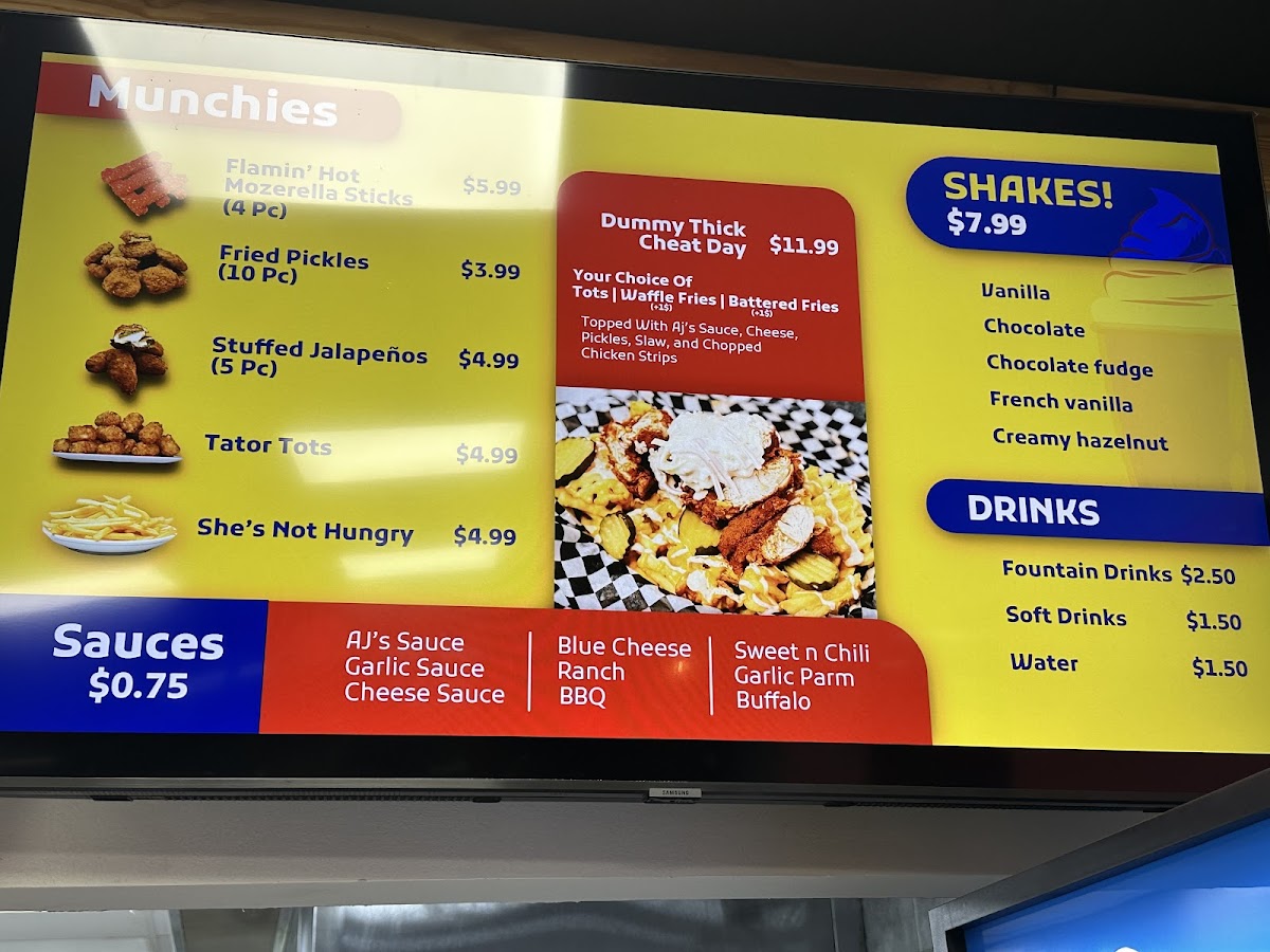 Waffle Fries, Topped With Aj’s Sauce, Pickles, Slaw, and Chopped Chicken Strips.